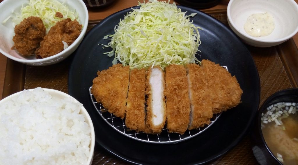 定番のとんかつ定食に、オプションで牡蠣フライを付けちゃいました。内容も盛り付けも「かつや」を意識したっぽい印象。
