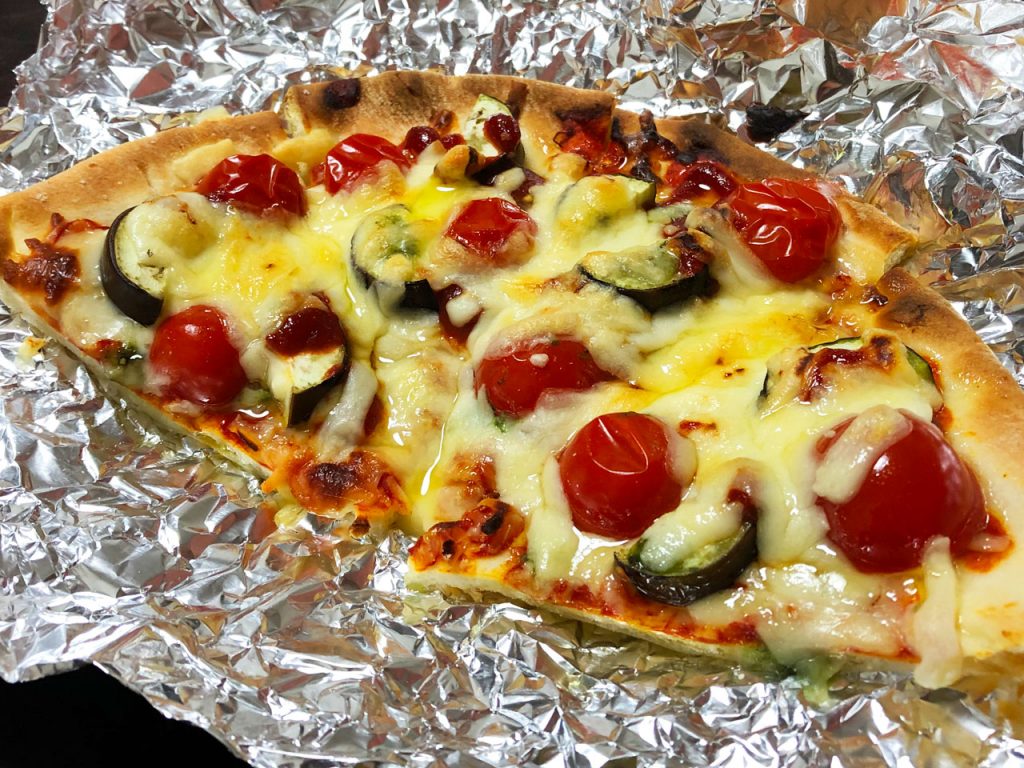 茄子とプチトマトを乗せて、追いチーズして焼いたら、こんな感じになりました。