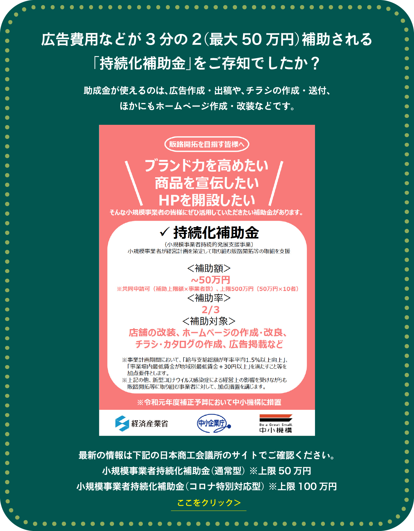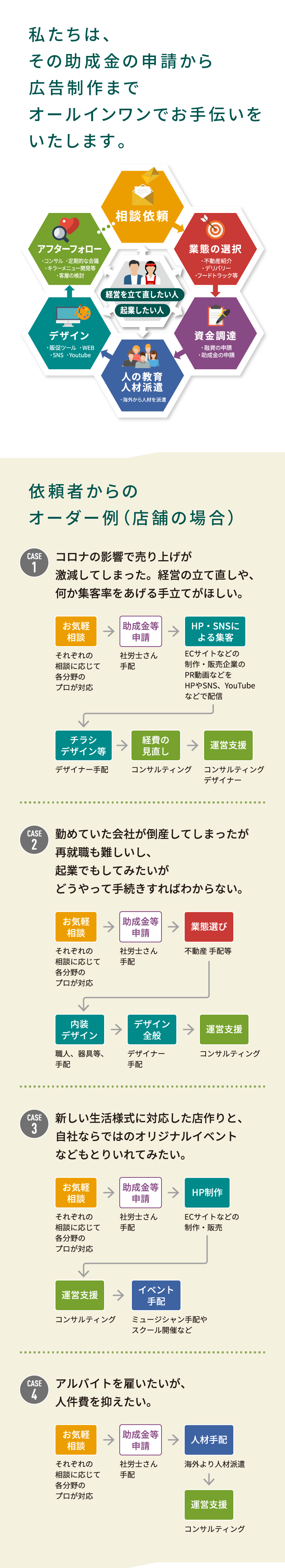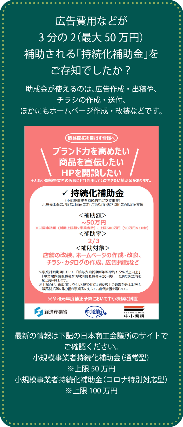 この新型コロナウイルス拡大の状況だからこそ、飲食店様が活用できる関係省庁のホームページで公開されている様々な「助成金・融資・補助金」などの公的支援がございます。助成金が使えるのは、広告作成・出稿や、チラシの作成・送付、ほかにもホームページ作成・改装などです。例えば、広告費用では広告制作費の3分の2(最大50万円)までが補助されます。私たちはこの難局を共に乗り越えていくために、その助成金の申請から広告制作、ホームページ、動画制作、不動産手配、内装デザインなどのお手伝いをさせていただきます。